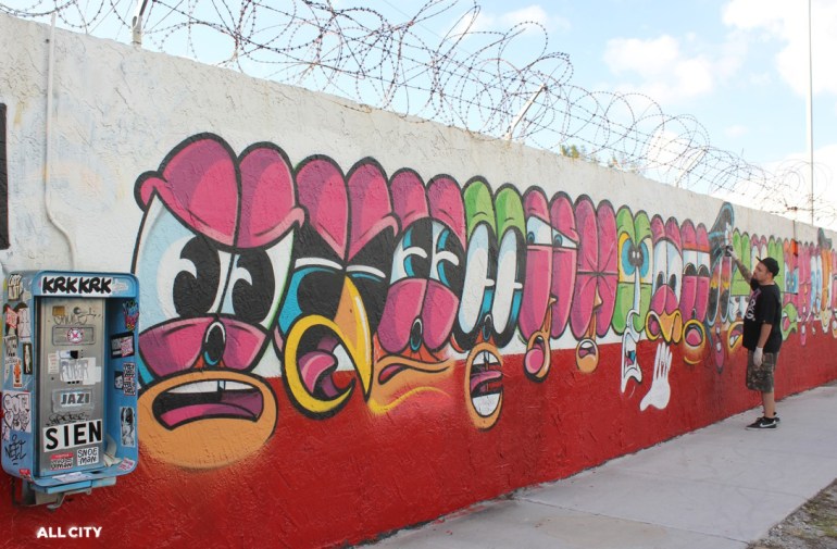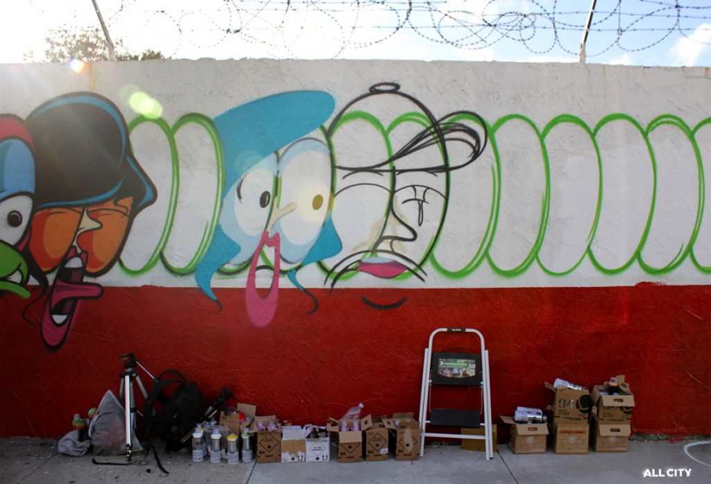 With this in mind Rime sketched out 13 of his characters for use on the wall in Miami. However, in reality, the wall was a little longer than the 13 characters originally envisaged. In fact it was almost 5 times longer! Rime therefore created the remianing 37 characters freestyle, which he described as “a real pain in the ass due to all of the foot traffic, chaos, and people approaching me while working over the weekend”.
