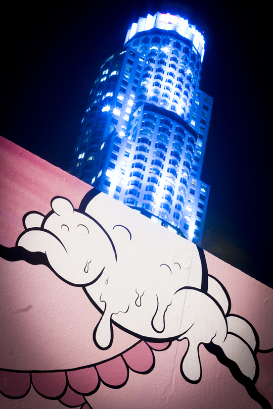 Buff Monster, the Hawaiian-born artist who currently lives in LA, recently completed a monster mural (in more ways than one) in his current city near the Standard Hotel at 550 South Flower & Sixth Street. More info and photos after the jump.