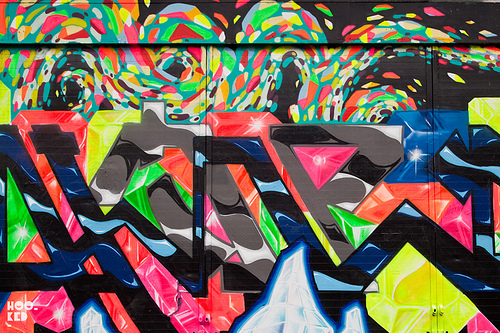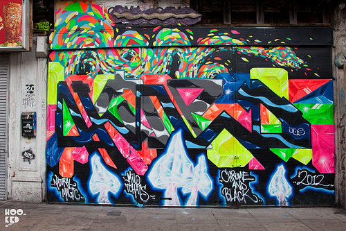 The shutter that we covered earlier in the week by Milo Tchais, the Brazilian Londoner, is now finished and looks fantastic. Thanks to Hookedblog.co.uk we are able to see the shutter as it stands now. The colours on this piece are really vivid and intense combined with the interesting and psychedelic-ish depiction! Nice work! UKB