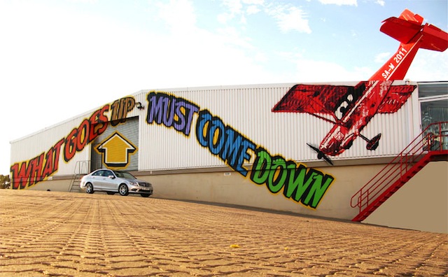 Above‘s work is undoubtedly amongst some of the most instantly recogniseable at the moment. Despite his origins in ‘traditional’ graffiti back in 1995 when he spent his time painting the freight trains of California, Above is best known for his upward pointing arrows, and more recently his stencils and letter work. Earlier this year he painted this warehouse in Cape Town, incorporating the tail of an aircraft into the painting. Looks incredible!
