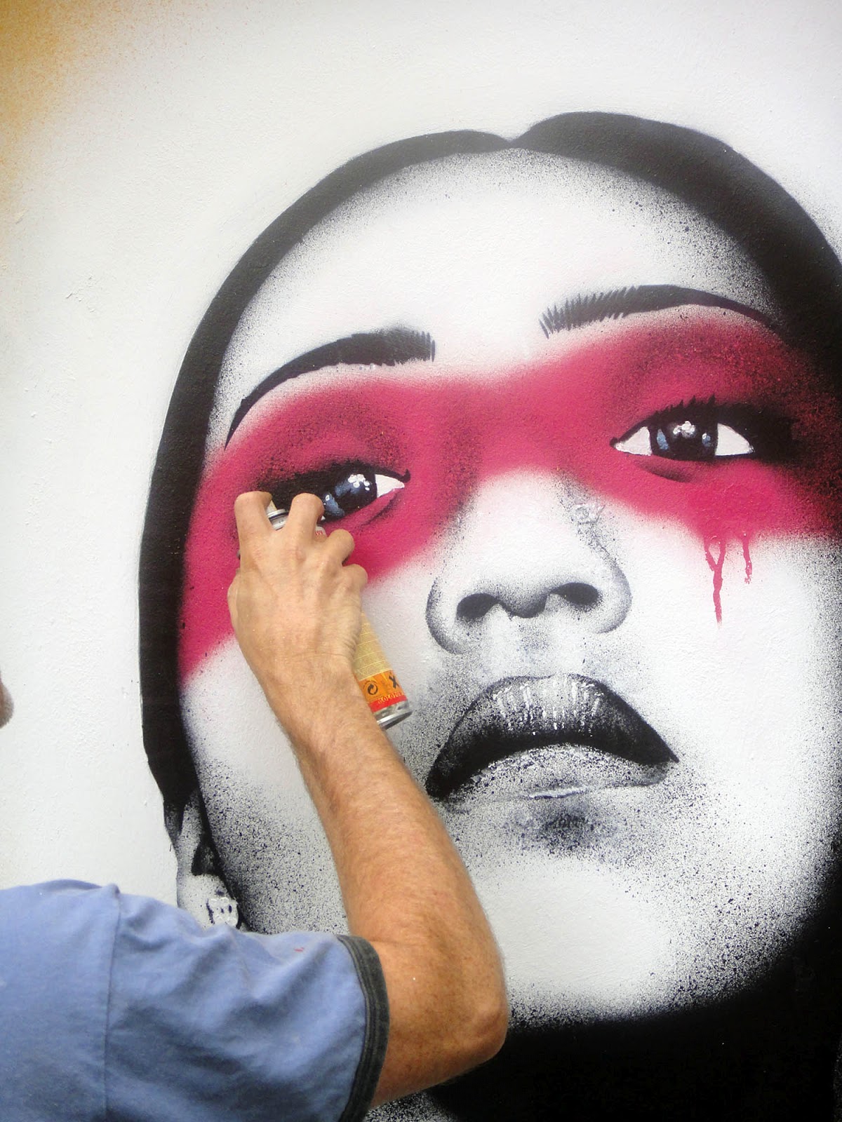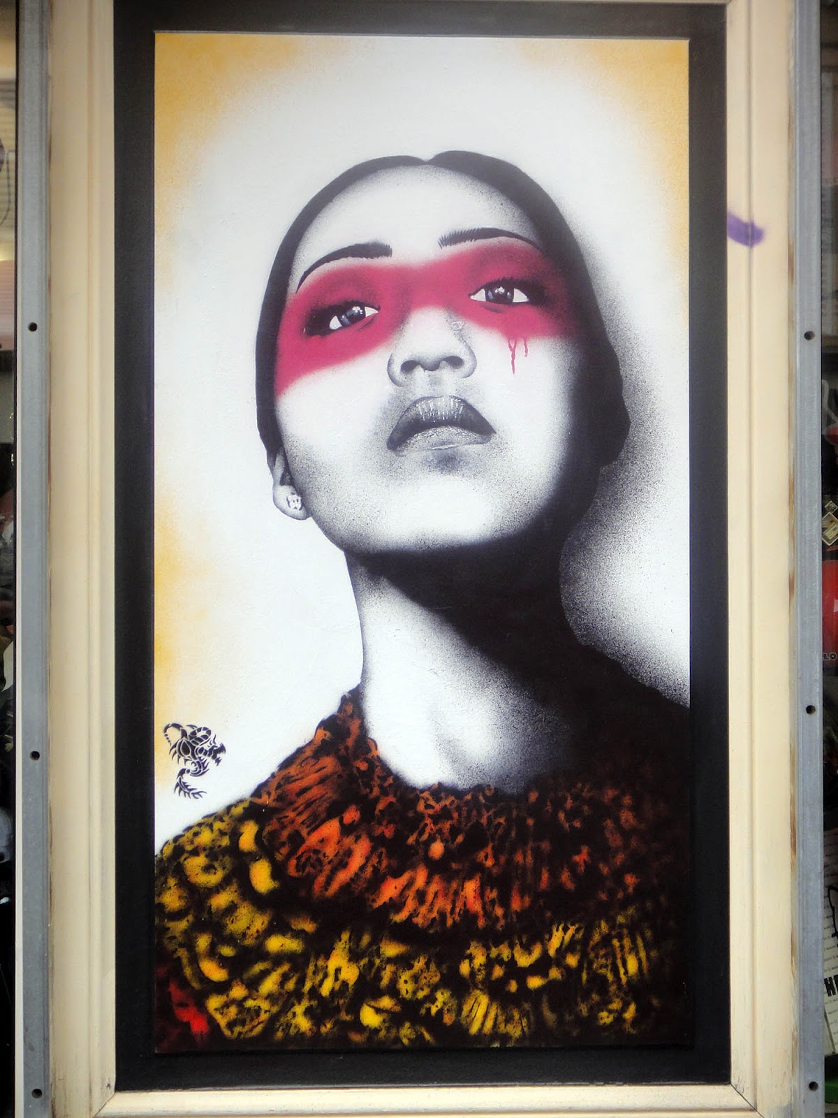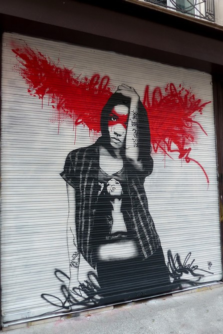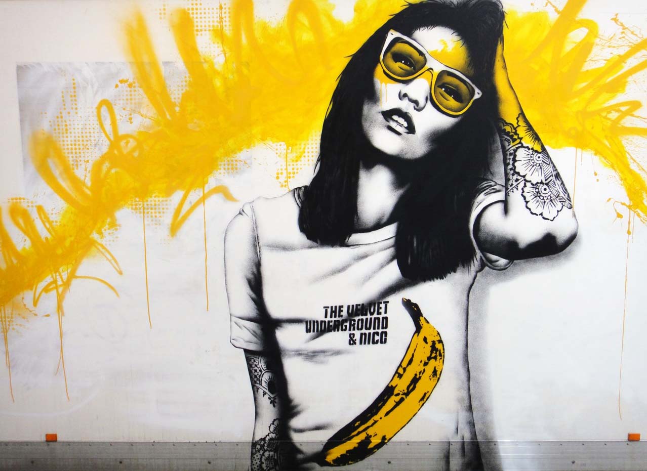 Back to this latest work by Fin DAC, though. You may remember his piece back in East London back in April, his style is certainly distinctive mixing realistically painted portraits of beautiful women, often incorporating stencil work, with a splash of colour to give the street/urban feel and draw your attention as you wander past.