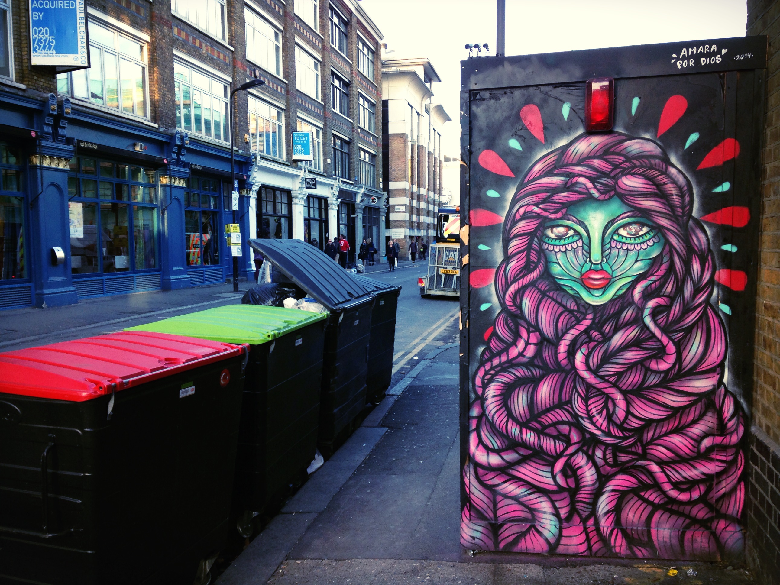 Swedish artist and designer Amara por Dios, now living in London, created this just across from one of my favourite spots in this part of town, the Book Club. Her designs are great, her t-shirts I particularly like, with that vibrant Incan/Aztec inspiration bubbling just beneath the surface.