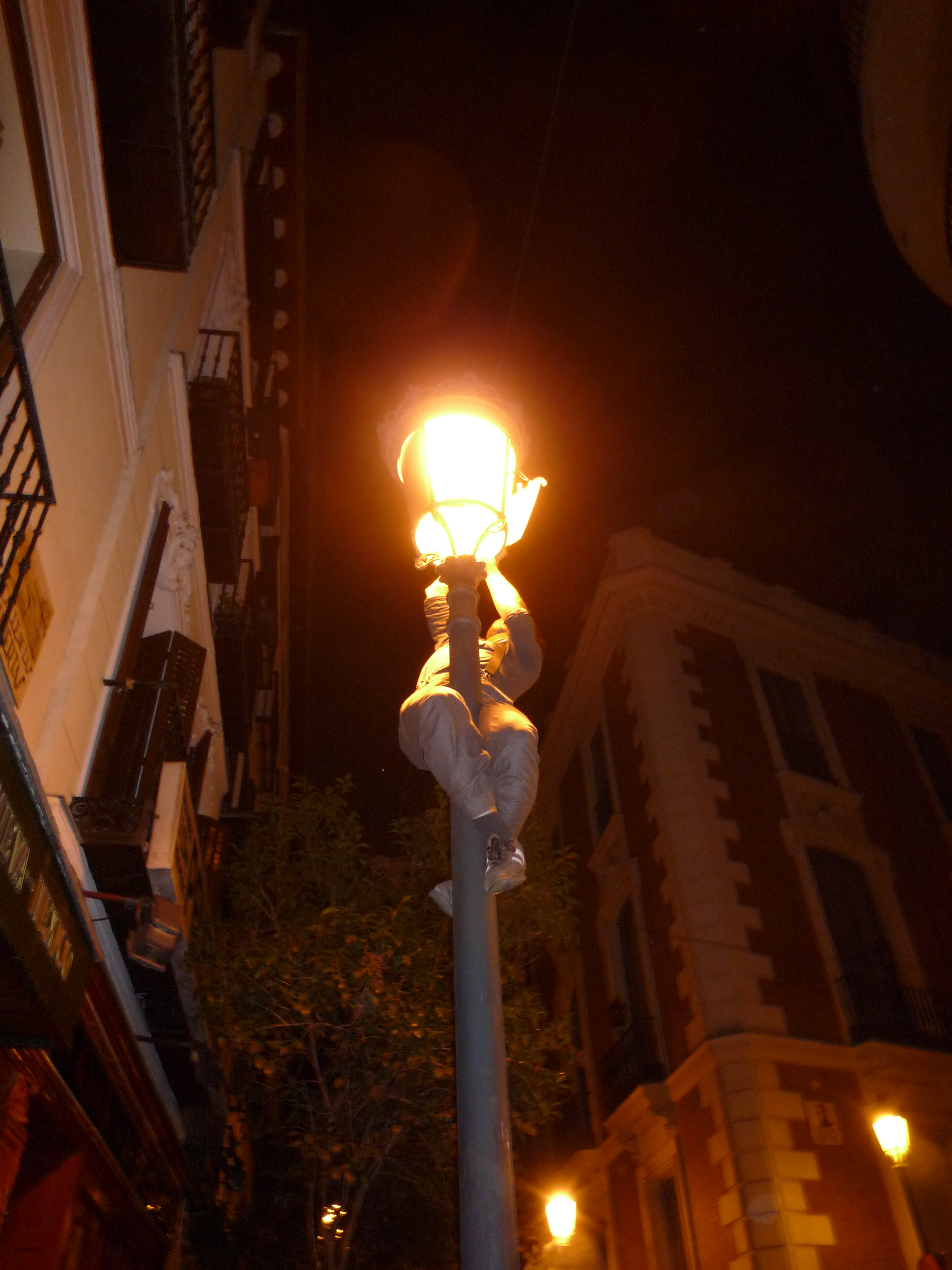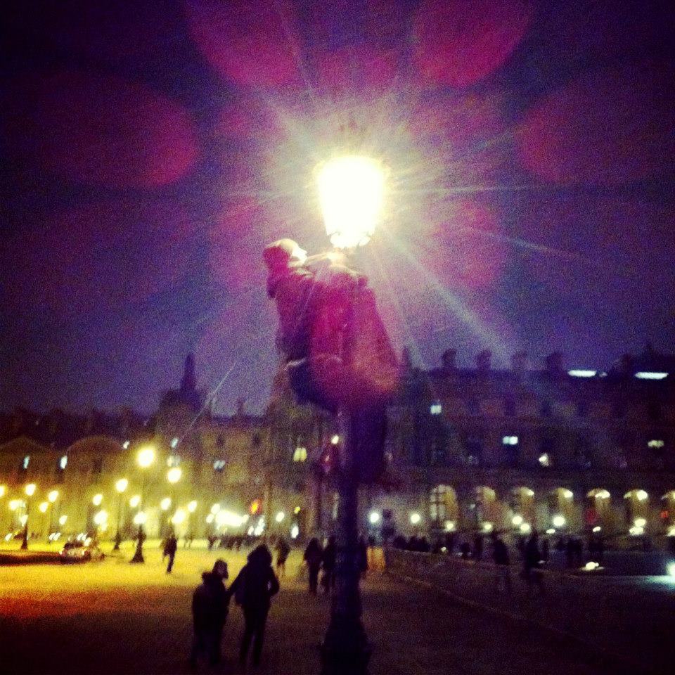 It’s a tough job, but someone’s got to do it. Scaling a lamp post in the name of art.