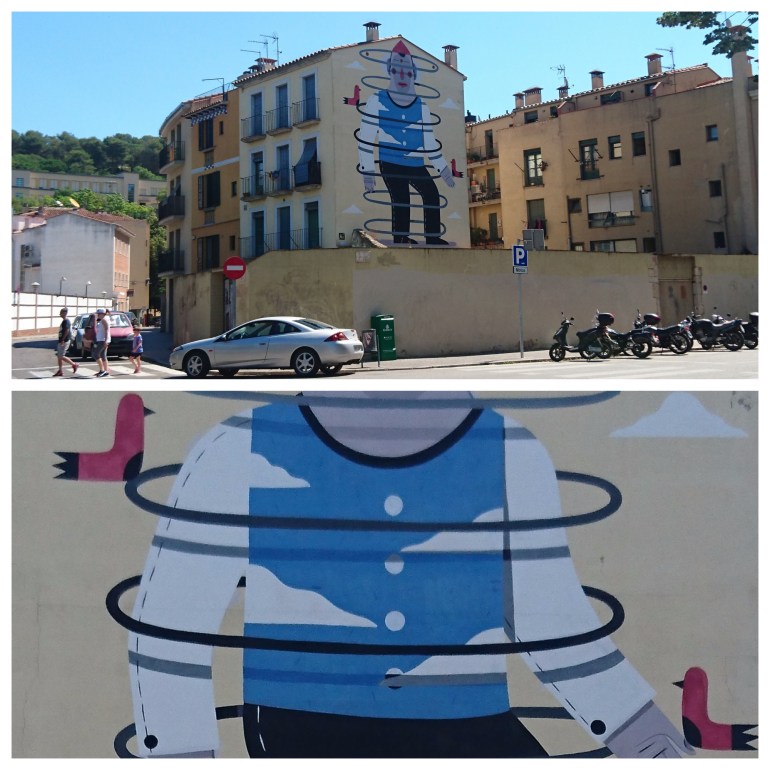 Heading north from here you’ll pick off some of the best pieces Girona’s got on offer – first up 3TTMAN – pronounced “Trois Têtes Man” – which you can see in this piece. Most likely spotted painting his flat, playful characters around Madrid, his other talents include videography  and photography.
