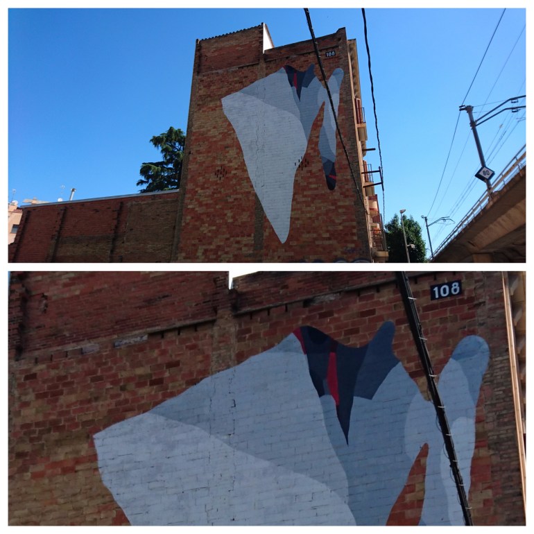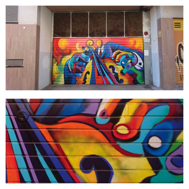 This first piece is tucked away on a shutter off the main Carrer d’En Tomàs Mieres/Carrer Bonastruc de Porta drag, but the colourful work from Pau Morales was enough to catch my eye and take me off track momentarily.